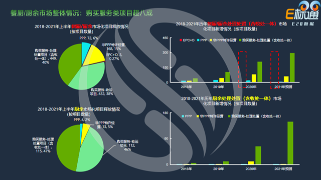 首先來看餐廚/廚余垃圾處理市場的整體情況。從左上圖,可以看到2018-2021年上半年,市場釋放的餐廚/廚余垃圾市場化項目以購買服務(wù)模式為主;右上圖是餐廚/廚余垃圾處理處置(含收處一體)市場化項目的歷年新增情況,2020年開始出現(xiàn)“EPC+O”模式的項目。