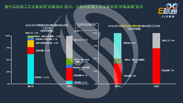 從處理工藝角度分析,左圖是餐廚垃圾處理處置市場化項目工藝分析占比圖,其中集中式處理方式主要采用的技術(shù)工藝是厭氧消化技術(shù),占比為61.8%,分散式處理方式主要采用的是好氧發(fā)酵技術(shù)。