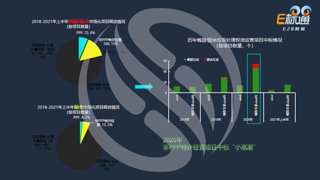 對餐廚/廚余垃圾PPP和非PPP特許經(jīng)營類市場化項目進行分析。右圖是歷年餐廚/廚余垃圾投資運營類項目的中標情況,2020年非PPP特許經(jīng)營項目存在中標的“小高峰”,E20研究院執(zhí)行院長、湖南大學兼職教授薛濤曾在“2020(第十四屆)固廢戰(zhàn)略論壇”上做題為《“十四五”固廢行業(yè)規(guī)劃與產(chǎn)業(yè)趨勢前瞻》的主旨演講,其中講到環(huán)衛(wèi)和焚燒等細分領(lǐng)域同樣迎來非PPP特許經(jīng)營項目的一個中標小高峰。但不同服務(wù)模式的項目合規(guī)與否、合理與否,薛院長在演講中做了詳細的各細分領(lǐng)域合理合規(guī)的邏輯分析。