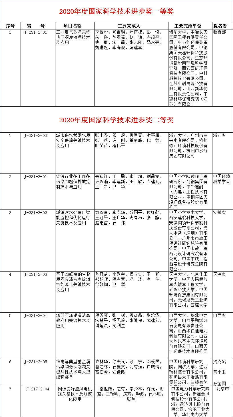 環(huán)境商會匯總整理了生態(tài)環(huán)境領域獲獎名單,共有11個項目榮獲2020年國家科技獎,其中,王愛杰、彭永臻、中國科學院生態(tài)環(huán)境研究中心程浩毅、梁斌、中持股份邵凱、信開水環(huán)境侯鋒等共同完成的“污水深度生物脫氮技術及應用”項目榮獲國家技術發(fā)明獎二等獎,李俊華,郝吉明、中節(jié)能環(huán)保裝備等聯(lián)合完成的“工業(yè)煙氣多污染物協(xié)同深度治理技術及應用”項目榮獲國家科技進步獎一等獎;俞漢青、中節(jié)能國禎、光大水務等聯(lián)合完成的“城鎮(zhèn)污水處理廠智能監(jiān)控和優(yōu)化運行關鍵技術及應用”;新疆金風科技等申報的“網(wǎng)源友好型風電機組關鍵技術及規(guī)?;瘧?rdquo;等項目榮獲國家科技進步二等獎。