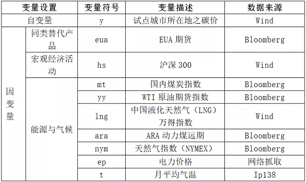 回顧上述文獻(xiàn)可以發(fā)現(xiàn),多數(shù)國(guó)內(nèi)外學(xué)者的研究證實(shí)了同類替代品、宏觀經(jīng)濟(jì)活動(dòng)、能源與氣候變化會(huì)對(duì)碳價(jià)有較為顯著的影響。為了進(jìn)一步探究這一系列影響因素對(duì)碳價(jià)的共同影響,并比較其相關(guān)性,本文將在這三個(gè)層面選取部分代表性指標(biāo),并將其聯(lián)立以分析影響結(jié)果。