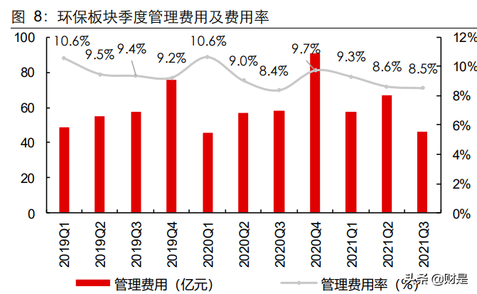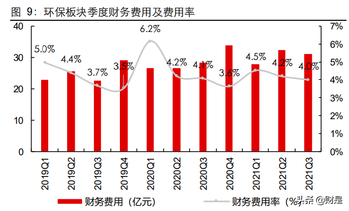 費(fèi)用端得到控制:2021Q1-Q3環(huán)保板塊期間費(fèi)用累計(jì)支出為361.8億元,同比增14.6%, 期間費(fèi)用率同比降1.2pct至15.7%。費(fèi)用率方面,銷售費(fèi)用率 2.8%,同比降0.41pct;管理費(fèi)用(含研發(fā)費(fèi)用,下同)率8.8%,同比降 0.37pct;財(cái)務(wù)費(fèi)用率4.1%,同比降0.41pct。期間費(fèi)用率同比下行的主要原因是:疫情后,收入同比大幅增長(zhǎng)23.3%,致期間費(fèi)用率顯著下行。2021Q1-Q3期間費(fèi)用增速分別為:檢測(cè)同比增31.3%,期間費(fèi)用率同比降 1.1pct至33.6%;水務(wù)運(yùn)營(yíng)同比增20.4%,期間費(fèi)用率同比降1.1pct至14.7%;監(jiān)測(cè)同比增17.8%,期間費(fèi)用率同比增4.8pct至42.5%;固廢同比增15.0%,期間費(fèi)用率同比降0.55pct至11.8%;大氣同比增10.3%,期間費(fèi)用率同比降 0.88pct至14.4%;水(工程設(shè)備)同比增9.6%,期間費(fèi)用率同比降 4.0pct 至 20.5%;節(jié)能同比增2.4%,期間費(fèi)用率同比降2.2pct 至 13.8%。