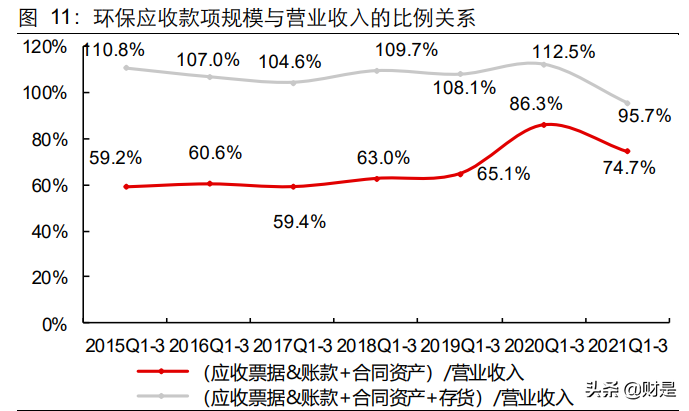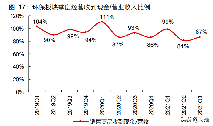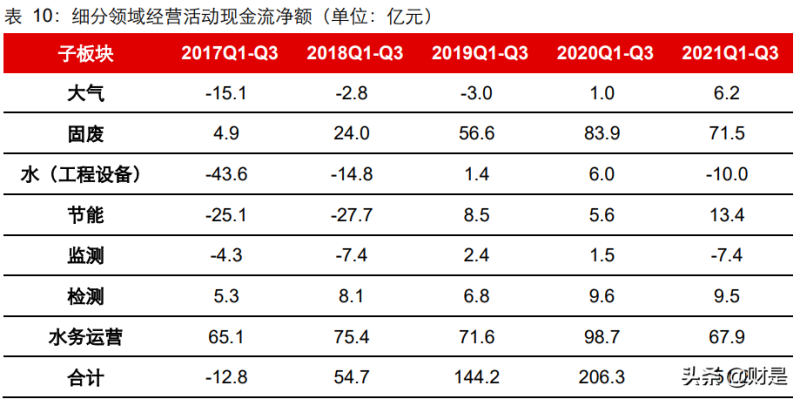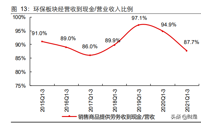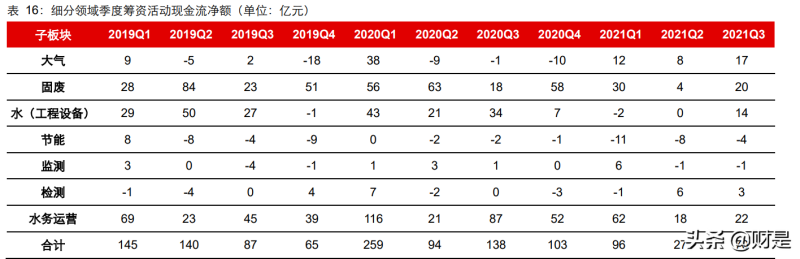 現(xiàn)金流量表:收入快速增長(zhǎng)致收現(xiàn)比下行,投融資數(shù)據(jù)環(huán)比回暖2021Q1-Q3 環(huán)保板塊銷售商品收到現(xiàn)金/營(yíng)收比率(收現(xiàn)比)為 87.7%,同比降 7.2pct,處于歷史數(shù)據(jù)區(qū)間內(nèi);經(jīng)營(yíng)活動(dòng)、投資活動(dòng)及籌資活動(dòng)產(chǎn)生的現(xiàn)金流量?jī)纛~分別 151 億 元(去年同期為 206 億元,同比降 27%)、-526 億元(去年同期為-680億元,凈支出同 比減少 23%)和 197 億元(去年同期為 540 億元,同比降 64%)。收入快速上行致收現(xiàn)比下降,并非回款惡化。環(huán)保行業(yè)收入存在收款周期,而收入的快速上行致當(dāng)期收現(xiàn)比下降,并非行業(yè)回款惡化。行業(yè)經(jīng)歷過2018年 PPP 現(xiàn)金流風(fēng)險(xiǎn)后,各公司重視回款,推動(dòng) PPP 項(xiàng)目轉(zhuǎn)EPC模式,工程、設(shè)備銷售等業(yè)務(wù)控制客戶質(zhì)量,并強(qiáng)化前期應(yīng)收賬款回款等,使得行業(yè)現(xiàn)金流好轉(zhuǎn),結(jié)合前文對(duì)應(yīng)收賬款的討論,也可證明回款在向好。