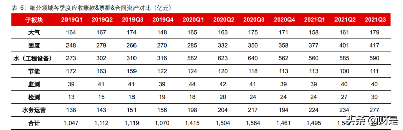 考慮到當(dāng)下部分公司將實(shí)質(zhì)的應(yīng)收賬款名義上放至存貨科目名下,故我們考慮存貨后, 2021Q3 末應(yīng)收賬款&票據(jù)+存貨+合同資產(chǎn)同比增 4.9%,(應(yīng)收賬款&票據(jù)+存貨+合同 資產(chǎn))/營(yíng)業(yè)收入同比降16.8pct,變動(dòng)原因:1)水(工程設(shè)備)、節(jié)能、大氣的(應(yīng)收賬款&票據(jù)+存貨+合同資產(chǎn))絕對(duì)值有所下降,分別降 6.6%、6.4%、1.6%,強(qiáng)化了回款;2)各子行業(yè) 2021Q1-Q3 均獲得營(yíng)收正增長(zhǎng),行業(yè)整體同比增 23.3%,特別是檢 測(cè)、水(工程設(shè)備)的同比增速在 30%以上。