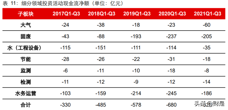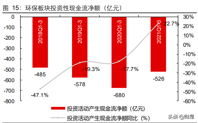 水務(wù)出現(xiàn)下行,主要是首創(chuàng)環(huán)保/中原環(huán)保/聯(lián)泰環(huán)保因業(yè)務(wù)需要,備貨增加,經(jīng)營(yíng)活動(dòng)現(xiàn)金流出同比增加20.6/19.7/5.7億元,造成下行。2021Q1-Q3環(huán)保板塊投資活動(dòng)凈支出同比降 23%達(dá) 526 億元,主要是水(工程設(shè)備)方向的投資性凈支出大幅下降,2021Q1-Q3 的支出為 35 億元,遠(yuǎn)低于2020Q1-Q3 的 114 億元;而固廢、水務(wù)運(yùn)營(yíng)板塊的投資活動(dòng)現(xiàn)金流凈支出分別達(dá)205/186億元,同比存在一定程度下降,但仍保持了相當(dāng)規(guī)模,與該兩個(gè)方向仍處于成長(zhǎng)期有關(guān),預(yù)計(jì)資本開支的需求將維持;投資活動(dòng)現(xiàn)金流也反映了資金投向的項(xiàng)目整體質(zhì)量有所提升。