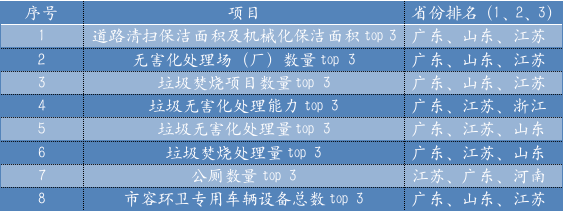 2、2020年環(huán)衛(wèi)設(shè)施投資大提速2020年市容環(huán)衛(wèi)和垃圾處理基礎(chǔ)設(shè)施固定資產(chǎn)投資1568.4億元,其中市容環(huán)衛(wèi)投資862.6億元,垃圾處理設(shè)施投資705.8億元,這兩個(gè)數(shù)字較2019年增長(zhǎng)了54.75%和73.50%,目測(cè)是10年來增速最快的一年。環(huán)衛(wèi)真的是朝陽產(chǎn)業(yè)??!3、有的省在環(huán)衛(wèi)和垃圾處理固定資產(chǎn)投資為0上文提到固定資產(chǎn)投資,全國花了1568個(gè)億,但也有個(gè)別省份交了白卷,例如西藏,在這兩方面的投資均為0,而青海,雖然在市容環(huán)衛(wèi)設(shè)施方面花了1個(gè)多億,但垃圾處理基礎(chǔ)設(shè)施投資也是0.有0就有top 5,2020年,在市容環(huán)衛(wèi)設(shè)施方面投資最大的省份是:廣東(102.2億)、江蘇(93.5億)、浙江(61.4億)、河南(59.4億)、河北(57.1億),垃圾處理設(shè)施建設(shè)方面投資最大的省份是:廣東(97.3億)、江蘇(84.6億)、浙江(53.8億)、河北(49.7億)、河南(48.3億)。是的,你沒看錯(cuò),前三沒有變化,只有第四和第五位是河南、河北在移形換位。如果沒有特殊情況,未來幾年內(nèi),這五個(gè)省的環(huán)衛(wèi)和垃圾處理設(shè)施投資會(huì)繼續(xù)名列前茅,相關(guān)企業(yè)需要重視了!4、全國市容環(huán)衛(wèi)實(shí)力哪家強(qiáng)?表5 全國市容環(huán)衛(wèi)行業(yè)主要指標(biāo)排名前三位省份