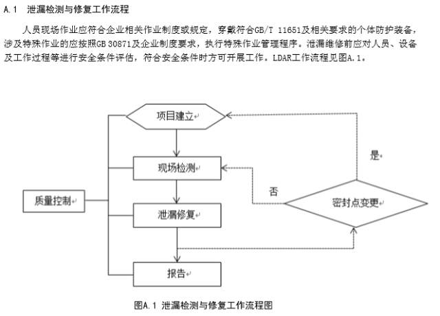 LDAR工作流程包括項目建立(資料收集、密封點識別、密封點檔案建立)、現(xiàn)場檢測和泄漏修復(fù)等 步驟。若企業(yè)因開停工、檢維修以及改擴建等原因發(fā)生密封點變更的,需重新建立密封點檔案后開展現(xiàn) 場檢測和泄漏修復(fù)工作。LDAR工作流程按照附錄A進行。