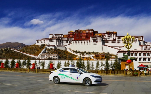 新能源出租車從布達拉宮廣場前駛過(2018年2月11日攝)。 新華社發(fā) 央梅朵 攝