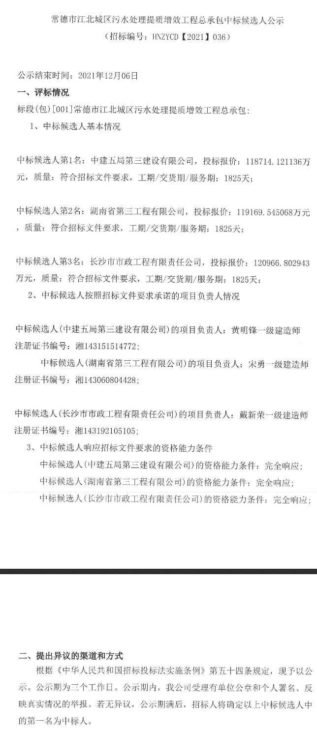 原標題:常德市江北城區(qū)污水處理提質增效工程總承包中標候選人公示