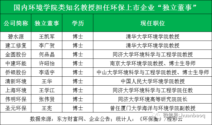 ? 第二,環(huán)境學(xué)院類知名教授。筆者還發(fā)現(xiàn)一個(gè)現(xiàn)象,有些環(huán)境院校的知名教授也兼職了獨(dú)立董事一職,不少還是業(yè)內(nèi)熟悉的面孔。比如業(yè)內(nèi)大咖王凱軍老師,既是碧水源的獨(dú)立董事,也是北控水務(wù)的獨(dú)立董事;再如同濟(jì)大學(xué)的何品晶老師,也是身兼數(shù)職,同時(shí)擔(dān)任金圓股份獨(dú)立董事、寶武集團(tuán)環(huán)境資源科技董事、天津建昌環(huán)保董事等,還有中山大學(xué)教授李適宇也擔(dān)任著僑銀股份的獨(dú)立董事。▼擔(dān)任上市環(huán)企獨(dú)立董事一職的環(huán)境學(xué)院類教授