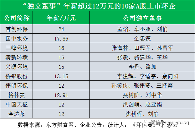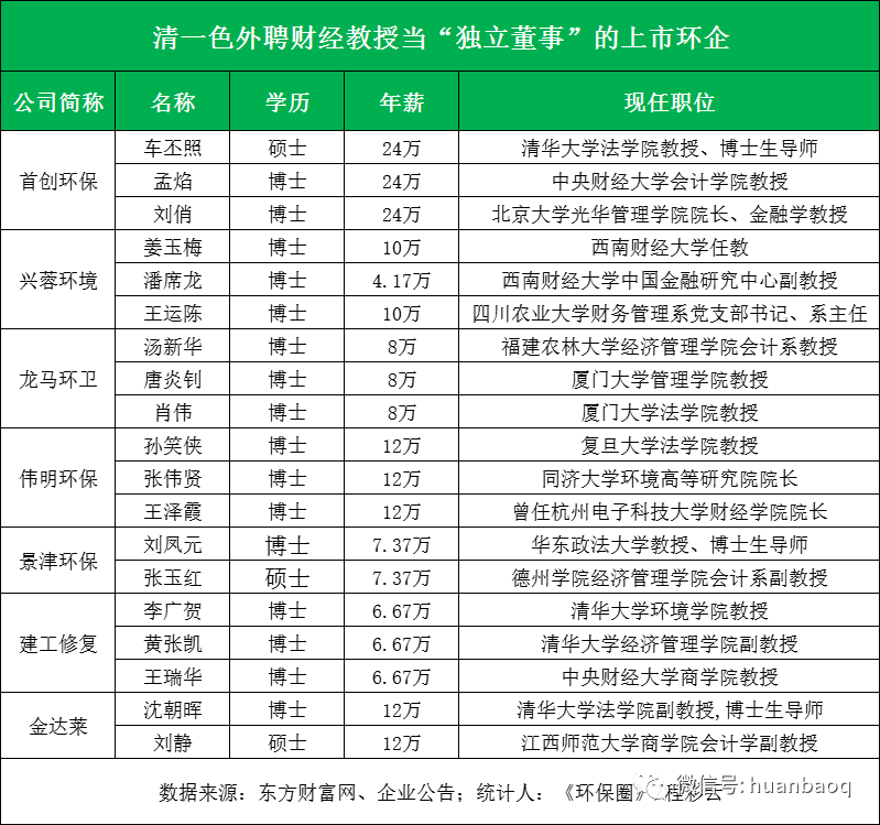 揭秘A股50家上市環(huán)企的132位獨(dú)董:簡單了解獨(dú)董職責(zé)之后,我們回歸環(huán)保行業(yè),談一談A股上市環(huán)企的獨(dú)立董事們。筆者查閱資料發(fā)現(xiàn),自從康美案落定后,A股上市環(huán)企中,還真有兩家上市環(huán)企獨(dú)董因個(gè)人原因提交了辭呈。一位是年薪僅5千元的富春環(huán)保獨(dú)立董事林潔,另一位是新三板公司博芳環(huán)保的獨(dú)立董事陳麗紅。兩個(gè)人都是因?yàn)?/span>“個(gè)人原因”提交的辭呈,巧合的是,辭職的時(shí)間都是在康美處罰案落地前后。排除這兩家之外,《環(huán)保圈》發(fā)現(xiàn),A股上市環(huán)企絕大多數(shù)獨(dú)立董事都比較淡定,沒有在敏感時(shí)期提出辭職。為了讓讀者進(jìn)一步了解上市環(huán)企獨(dú)董的背景,《環(huán)保圈》對(duì)A股50家上市環(huán)企中132位獨(dú)立董事進(jìn)行了逐一統(tǒng)計(jì),從而進(jìn)一步觀察他們年薪、學(xué)歷、背景、從業(yè)經(jīng)歷。首先,每家上市環(huán)企外聘的獨(dú)立董事數(shù)量幾乎是一樣的,都是3-4個(gè)。這跟證監(jiān)會(huì)要求有關(guān),“上市公司獨(dú)立董事人數(shù)不得少于董事會(huì)成員的1/3”。由于環(huán)保上市企業(yè)本身規(guī)模不大,董事會(huì)成員大多在10人左右,所以匹配3-4個(gè)獨(dú)立董事最為合適。其次,從薪資上看,每家企業(yè)外聘獨(dú)立董事的工資也是不一樣的。最高的當(dāng)屬首創(chuàng)環(huán)保,分別給予孟焰、車丕照、劉俏教授年薪24萬/年;其次是國中水務(wù),其獨(dú)立董事金忠德薪酬17.86萬元/年;再者還有三峰環(huán)境、清新環(huán)境、興源環(huán)境、偉明環(huán)保、僑銀股份、格林美,中國天楹、金達(dá)萊等,這幾家企業(yè)對(duì)獨(dú)董也非常大方,年薪都在12萬/年以上,平均每月收入1萬元左右。▼獨(dú)立董事年薪超過12萬元的上市環(huán)企