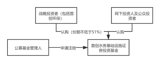 具體實施步驟為:首先,公募基金管理人富國基金向證監(jiān)會申請注冊首創(chuàng)水務(wù)基礎(chǔ)設(shè)施證券投資基金,取得注冊文件后,富國基金將基礎(chǔ)設(shè)施證券投資基金進行公開發(fā)售,其中首創(chuàng)環(huán)保或其同一控制下關(guān)聯(lián)方作為戰(zhàn)略配售投資人參與認購比例不低于本次基金份額發(fā)售數(shù)量的51%(實際發(fā)行時認購比例為51%)。