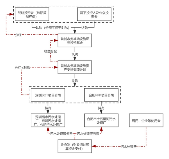 首創(chuàng)環(huán)保作為A股首家以綠色PPP項目為底層資產(chǎn)之一發(fā)行基礎(chǔ)設(shè)施REITs項目的上市公司,其通過公募基金-資產(chǎn)支持專項計劃-項目公司-基礎(chǔ)設(shè)施項目的結(jié)構(gòu)將綠色PPP資產(chǎn)納入REITs產(chǎn)品中。