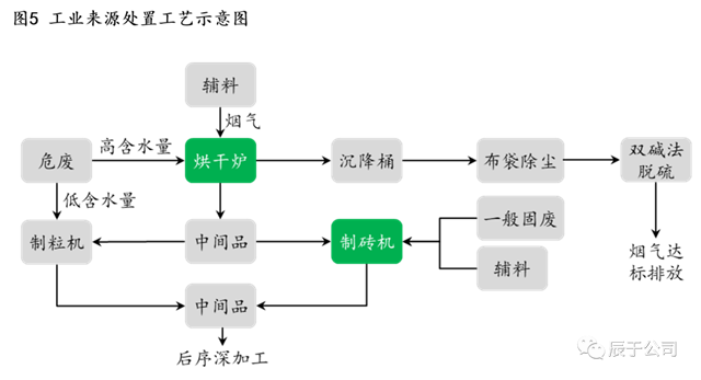 工業(yè)來源的再生有色金屬工藝相比復(fù)雜很多,一是原料種類繁多,有廢水、固廢等形態(tài);二是含量低且多數(shù)為有害物質(zhì),雖然也有含量高的生產(chǎn)邊角料,但大多是工業(yè)危廢,含量通常不高于5%。因此工業(yè)來源的處置工藝通常要根據(jù)具體的原料進(jìn)行處置,輔料、設(shè)備的投入更多,對企業(yè)的技術(shù)要求很高(見圖5)。