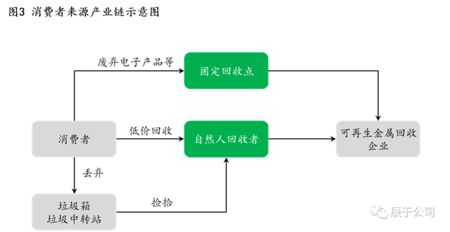 “消費(fèi)者來源”的回收產(chǎn)業(yè)鏈渠道相對較多且發(fā)達(dá),中間商的活動也十分活躍,多為自然人采購,不穩(wěn)定因素多,回收原料主要為電子產(chǎn)品等含可回收金屬的家用電器(見圖3)。例如飛南資源早期采用的是自然人采購這一特殊的采購模式,依托專門從事廢銅回收的自然人,2017-2018年間,向自然人采購占比超過四成。“消費(fèi)者來源”的回收率較高,基本上只要能值錢就會有人專門在收集、轉(zhuǎn)賣,更何況有色金屬單價高,廢銅的受歡迎程度比廢鐵要高得多。中國的易拉罐回收率超過99%也能夠說明這一點。