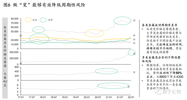 事實上,不同的有色金屬波動周期會有差異,同時具備多種有色金屬處置的技術(shù)和生產(chǎn)線,也能夠幫助企業(yè)抵抗行業(yè)的周期性風(fēng)險,根據(jù)測算,做多種再生金屬與僅做再生銅相關(guān)的業(yè)務(wù)相比,整體價格波動性能夠下降50%左右(見圖6)。