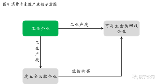 工業(yè)來源的回收渠道較少,中間商也不多,大多從產(chǎn)廢企業(yè)直接采購,回收原料主要為工業(yè)企業(yè)廢料(見圖4)。如屹通新材長期采用直接向產(chǎn)廢企業(yè)采購廢鎳、廢銅及廢鋼等原材料的模式,無中間商參與,來源較為穩(wěn)定,采購價格參考市場價格,2017-2020年間,其和6家本地企業(yè)簽訂了23個1000萬以上的大額原材料采購合同。