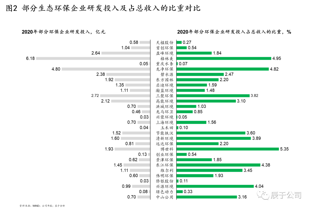 造成以上問(wèn)題的原因很多,主要有兩個(gè):一是國(guó)內(nèi)生態(tài)環(huán)保行業(yè)之前一直處于簡(jiǎn)單、粗暴的“跑馬圈地”時(shí)代,強(qiáng)政府關(guān)系和低成本融資成為這一階段企業(yè)制勝的“不二法寶”,這種“浮躁”的大環(huán)境導(dǎo)致很多企業(yè)“重投建、輕技運(yùn)”;二是創(chuàng)新型和革新型技術(shù)投入周期長(zhǎng),回報(bào)不明顯,很多企業(yè)尤其是三年任期制下的國(guó)企高層們?nèi)狈ψ銐蚰托?,容錯(cuò)機(jī)制缺失也讓他們對(duì)高風(fēng)險(xiǎn)的研發(fā)投入持謹(jǐn)慎態(tài)度,這從生態(tài)環(huán)保領(lǐng)域的上市企業(yè)的研發(fā)投入占收入的比重可見(jiàn)一斑(見(jiàn)圖2)。