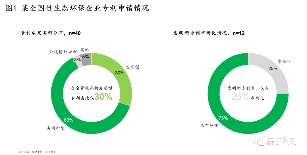 以我們服務(wù)過(guò)的某全國(guó)性生態(tài)環(huán)保企業(yè)為例,盡管營(yíng)業(yè)收入已近70億元,但當(dāng)年的研發(fā)投入不足1000萬(wàn)元,專(zhuān)利申請(qǐng)數(shù)區(qū)區(qū)40件,且63%的為實(shí)用新型專(zhuān)利,含金量較高的發(fā)明型專(zhuān)利僅占30%,其中又只有25%的進(jìn)行了商業(yè)應(yīng)用(見(jiàn)圖1)。