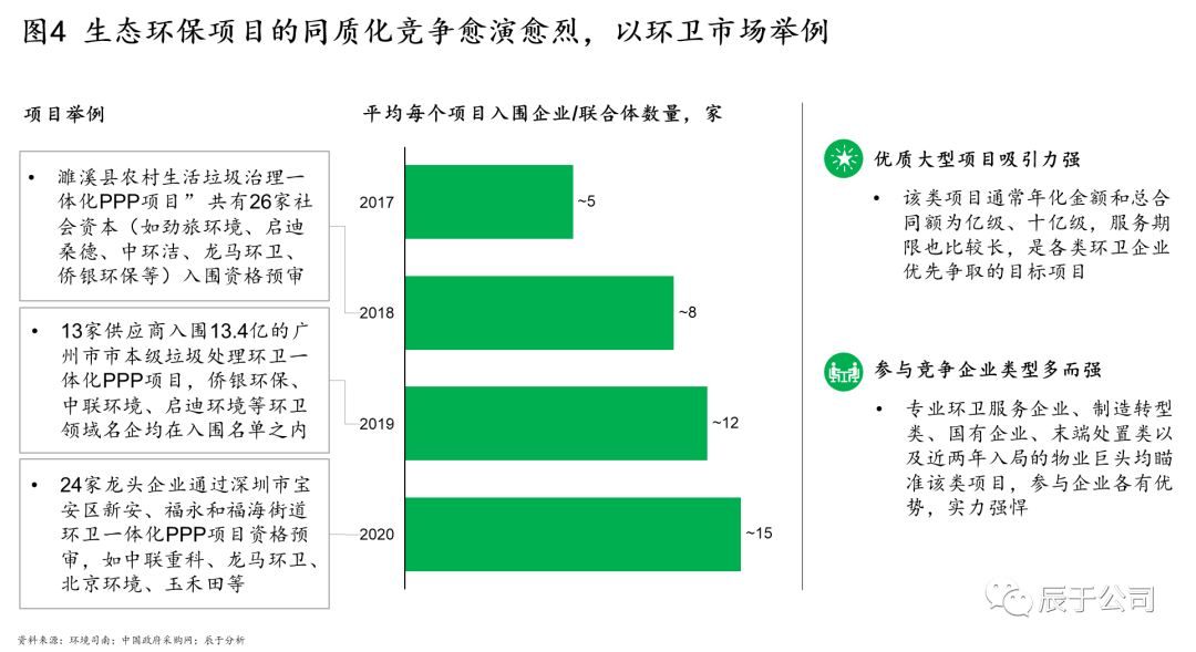 這樣帶來(lái)的直接后果就是同質(zhì)化競(jìng)爭(zhēng)愈演愈烈,價(jià)格戰(zhàn)時(shí)有發(fā)生,不僅影響企業(yè)的盈利水平,也對(duì)后期的運(yùn)營(yíng)帶來(lái)隱患。由于缺乏有門(mén)檻的技術(shù)壁壘,一些環(huán)保項(xiàng)目的招標(biāo)活動(dòng)動(dòng)輒十幾家甚至數(shù)十家企業(yè)參加(見(jiàn)圖4),而針對(duì)一些技術(shù)難度大的項(xiàng)目,要么無(wú)人問(wèn)津不敢接手,要么接手了之后最終陷于無(wú)計(jì)可施的尷尬境地。