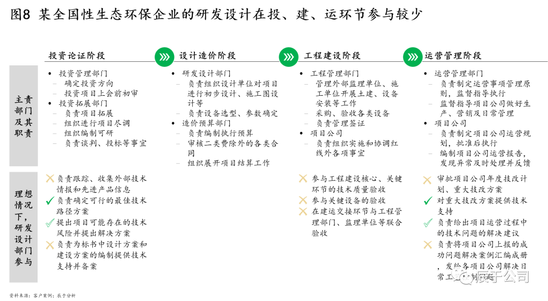 國(guó)內(nèi)生態(tài)環(huán)保企業(yè)“重投建、輕技運(yùn)”的問(wèn)題由來(lái)已久,由于沒(méi)有將研發(fā)設(shè)計(jì)放在一個(gè)正確的位置與高度,導(dǎo)致總部-事業(yè)部-項(xiàng)目公司的研發(fā)設(shè)計(jì)定位不清,該總部牽頭做的沒(méi)人做,該項(xiàng)目公司負(fù)責(zé)的,由于目的明確、相對(duì)簡(jiǎn)單,各級(jí)主體“搶著做”,原本有限的技術(shù)資源散亂在內(nèi)部的各個(gè)層級(jí)和角落,沒(méi)有形成各司其職、各盡其責(zé)、上下一致的合力。