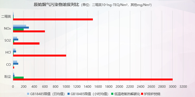 羅宇煊用云南水務在昆明周邊的兩個200噸級的垃圾處理廠的真實數(shù)據(jù),對低溫絕氧熱解碳化技術和爐排焚燒技術的主體布局、爐腔溫度、廠區(qū)工藝、煙氣處理和原始煙氣污染物濃度作了進一步的對比。