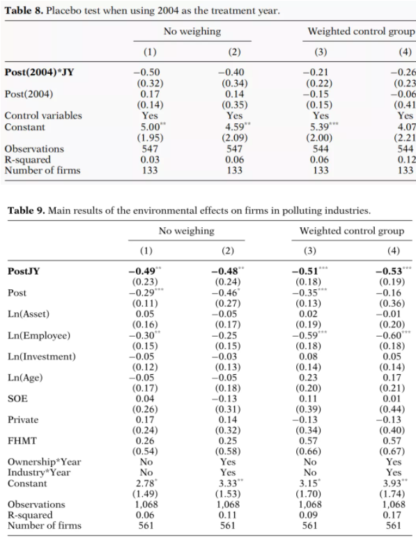 PostJY是本文最關(guān)心的變量,該變量的系數(shù)能夠刻畫(huà)江陰市綠色信貸政策的影響。表9顯示,該變量的系數(shù)負(fù)向顯著,由此可見(jiàn),該政策的實(shí)施使得江陰市顯著降低了污染排放強(qiáng)度。