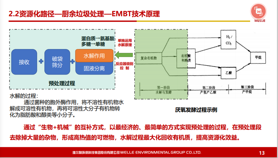 對(duì)于有機(jī)廢棄物的原料及核心技術(shù),可以說從城市有機(jī)廢棄物到農(nóng)村有機(jī)廢棄物,現(xiàn)在最核心的還是通過厭氧發(fā)酵技術(shù),最終通過沼氣化利用,達(dá)到無害化或者是環(huán)?;?,再盡可能實(shí)現(xiàn)資源化。國家發(fā)改委推出了一百個(gè)餐廚垃圾處理試點(diǎn)項(xiàng)目,之后進(jìn)行全方位地推出。在國內(nèi)真正運(yùn)行好的餐廚垃圾項(xiàng)目并不是特別多,主要工藝還是以厭氧為主。為什么這塊資源化的效率會(huì)好一些?尤其在“碳減排”的壓力下,使得出口價(jià)格一直比較好,這個(gè)行業(yè)最近稍微能夠掙點(diǎn)錢。另外,更深度的資源化利用,比如做有機(jī)質(zhì),食用的昆蟲養(yǎng)殖,也會(huì)有一些收益,再加上沼氣的收益。對(duì)于餐廚垃圾處理,我認(rèn)為如果到了一定規(guī)模,收益還是不錯(cuò)的。相對(duì)來說,廚余垃圾的資源化利用效率會(huì)差一些?,F(xiàn)在全國都在推行垃圾分類,不同城市廚余垃圾的質(zhì)量相差比較大。如上海的廚余垃圾含水率、油脂含量與餐廚垃圾是有一點(diǎn)類似的,含油量可能稍微小一點(diǎn),但在其他城市就相差非常大。廚余垃圾資源化是節(jié)省能源化的利用,以無害化為主,有一些也可以做食用昆蟲的養(yǎng)殖。 對(duì)于濕垃圾或者是廚余垃圾,我們特別推出一款技術(shù)——EMBT技術(shù)。結(jié)合生物水解技術(shù),原理是有機(jī)廢棄物或者有機(jī)物在厭氧發(fā)酵過程當(dāng)中主要是通過酸化水解以及產(chǎn)甲烷兩個(gè)階段,我們通過設(shè)施化的反應(yīng)器,把酸化水解在前面就能夠作為預(yù)處理,真正地溶解到水下面的有機(jī)物再到厭氧處理,這樣使得厭氧反應(yīng)器不要那么復(fù)雜,剩下的固渣資源化也會(huì)比較方便,去做水量化的利用都是可行的。這個(gè)工藝現(xiàn)在在上海包括在紹興做下來,還是受到比較多的認(rèn)可。