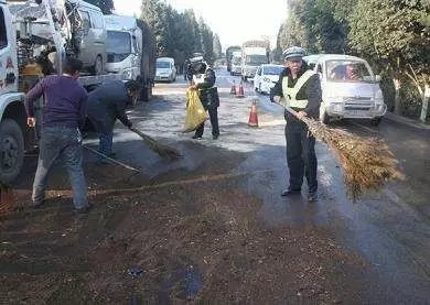 重油污路面,嚴(yán)重影響了市容市貌,交警叔叔也來幫忙清除了……