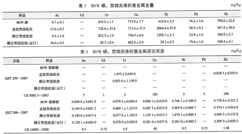 表3顯示:直接焚燒底灰中的As、Ni、Cu和zn的含量較高,而耦合焚燒底渣中Cr、Nj的含量也較高。HJ/T 299--2007浸出試驗(yàn)方法采用了酸化的去離子水作為浸出液,固液比為10,由標(biāo)準(zhǔn)GB 5085.3—2007來(lái)判斷飛灰是否為危險(xiǎn)廢物HJ/T 300---2007的試驗(yàn)方法采用了醋酸作為提取液,固液比為20,由標(biāo)準(zhǔn)GB 16889—2008來(lái)判斷廢物是否適合衛(wèi)生填埋。表4中的數(shù)據(jù)表明,底灰和爐渣均適合填埋,雖玻璃化底渣保留了大部分重金屬,但因其低滲出性,仍然可以按衛(wèi)生填埋方式安全處置。