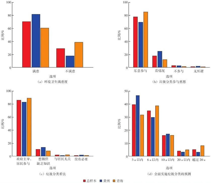 如圖2(a)所示,居民居住地環(huán)境衛(wèi)生滿(mǎn)意度為72%,高于東部地區(qū)的調(diào)查數(shù)據(jù)(均低于70%),當(dāng)?shù)厣罾芾韷毫赡茌^低,改善環(huán)境現(xiàn)狀的訴求可能較弱。在垃圾分類(lèi)緊迫性不足的條件下,居民是否支持垃圾分類(lèi)有待研究。貴州受訪者(82%)的環(huán)境衛(wèi)生滿(mǎn)意度高于青海受訪者(61%),青海居民改善當(dāng)前環(huán)境現(xiàn)狀的愿望更強(qiáng)烈,推測(cè)其參與意愿將更高(詳見(jiàn)3.2節(jié))。此外,環(huán)境衛(wèi)生滿(mǎn)意度仍有較大提升空間,垃圾分類(lèi)是有效策略之一。考慮到當(dāng)?shù)乩诸?lèi)仍處于起步狀態(tài),有必要制定針對(duì)性的垃圾分類(lèi)推廣模式,居民的環(huán)境問(wèn)題責(zé)任感知可作為重要參考依據(jù)。