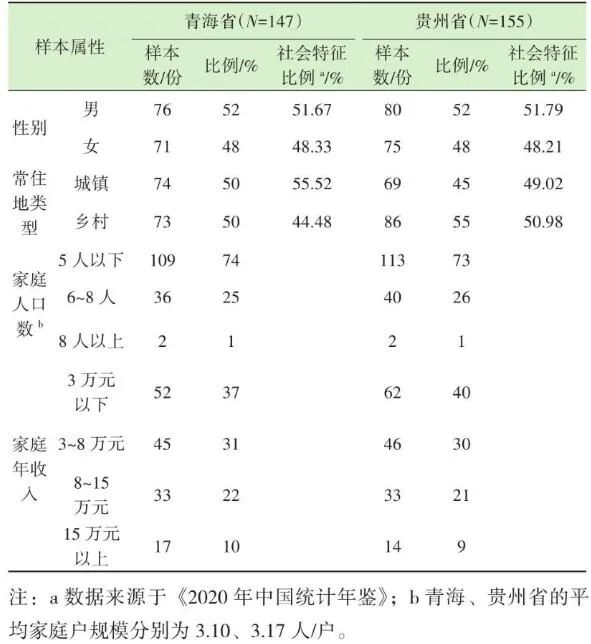 共回收302份有效問(wèn)卷,其中青海147份,貴州155份,調(diào)查對(duì)象以中學(xué)生為主,涉及不同性別、家庭收入水平、居住環(huán)境的各類(lèi)受訪者。其中男女比例接近1∶1,性別占比分布均衡;地域分布跨度較廣,涵蓋不同居住地類(lèi)型;與當(dāng)?shù)氐募彝ト丝诮Y(jié)構(gòu)特征相符;家庭收入水平涵蓋低中高各層次。整體上,調(diào)查樣本代表的社會(huì)屬性特征分別和西北、西南地區(qū)的分布特征一致,調(diào)查數(shù)據(jù)的代表性較好。
