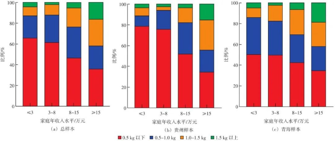 居民生活垃圾產(chǎn)率可能受家庭收入水平影響。變量之間的Pearson相關(guān)性分析表明,家庭收入水平與生活垃圾產(chǎn)率正相關(guān)(r=0.244,P<0.05),青海(r=0.200,P<0.05)、貴州(r=0.280,P<0.05)兩地樣本表現(xiàn)一致。如圖1(a)所示,隨著家庭收入水平的遞增,0.5 kg以下(產(chǎn)生量較低)的比例依次遞減,分別為66%、62%、47%、36%;1.0~1.5 kg(產(chǎn)生量較高)的比例總體遞增,分別為9%、10%、19%、26%;1.5 kg以上(產(chǎn)生量高)的比例總體遞增,分別為4%、2%、5%、16%。