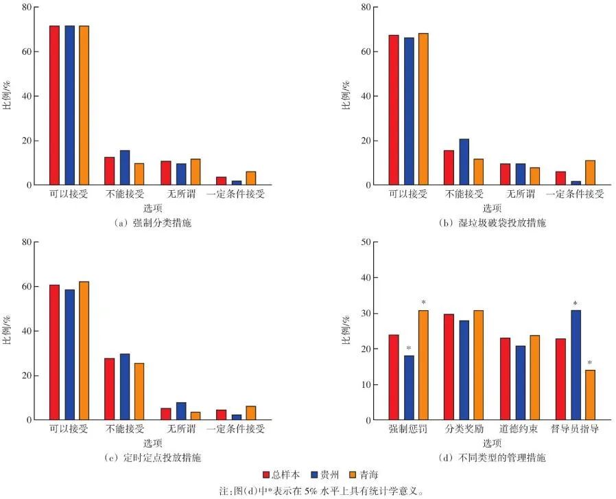 不同地區(qū)在垃圾分類(lèi)管理模式的選擇上應(yīng)有所側(cè)重。以卡方檢驗(yàn)分析兩地受訪者對(duì)管理模式的選擇差異,見(jiàn)圖5(d),兩地樣本在“分類(lèi)獎(jiǎng)勵(lì)”和“道德約束”兩項(xiàng)的選擇差異不顯著,而“強(qiáng)制懲罰”和“督導(dǎo)員指導(dǎo)”兩項(xiàng)的選擇存在顯著差異,因此強(qiáng)制型和引導(dǎo)型管理的側(cè)重更值得關(guān)注。青海居民更傾向于選擇“強(qiáng)制懲罰”(P<0.05),可能因?yàn)榍嗪5沫h(huán)境衛(wèi)生壓力和居民參與意愿相對(duì)較高。同時(shí)選擇“懲罰力度較低”的比例相對(duì)較高(圖3),當(dāng)?shù)貞土P力度不足問(wèn)題可能更突出,建議青海相對(duì)側(cè)重加強(qiáng)強(qiáng)制型管理。貴州居民更傾向于選擇“督導(dǎo)員指導(dǎo)”(P<0.05),貴州居民參與意愿和政策認(rèn)識(shí)水平相對(duì)較低,可能更需要督導(dǎo)員的專(zhuān)門(mén)指導(dǎo),建議貴州相對(duì)側(cè)重加強(qiáng)引導(dǎo)型管理。
