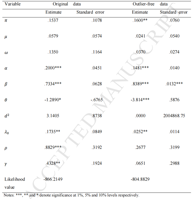 運用AR(1)-GARCH(1,1)模型對EUA回報的時間序列進行擬合,用擬極大似然估計法估計系數(shù),將超出正常波動范圍的回報率視為離群數(shù)據(jù),公式如圖1。AR(1)-GARCH(1,1)模型的優(yōu)點是即使對誤差項的分布形式選擇有誤,或者模型選擇有誤,仍能準(zhǔn)確找出離群值。