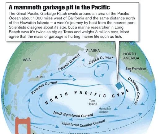 據(jù)科學(xué)家們粗略估計(jì),“第八大陸”由400萬噸塑料垃圾組成,占地面積達(dá)140萬平方公里,相當(dāng)于兩個(gè)美國得克薩斯州,約4個(gè)日本大小,是中國香港特區(qū)的1000倍。