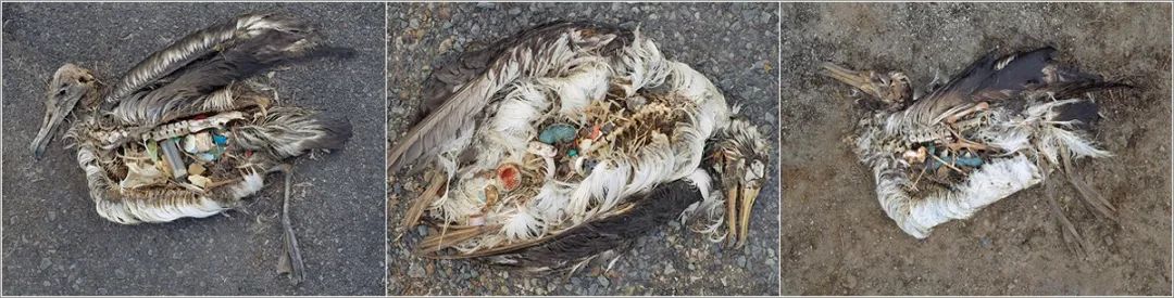 許多死亡的信天翁幼鳥體內(nèi)常見瓶蓋、塑料打火機(jī)、塑料兒童玩具、梳子、牙刷等塑料垃圾。吞下這些塑料制品會導(dǎo)致鳥類食道或器官被劃破,從而造成它們窒息或者因饑餓、脫水而死。