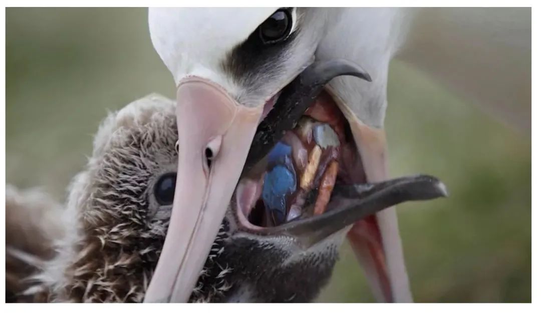 當(dāng)海鳥媽媽不遠(yuǎn)千里從海洋上帶回來食物,也就是撿拾來的塑料片直接就會喂給小海鳥,餓得發(fā)慌的小海鳥迫不及待地咬上一口,咬不動(dòng),又吐出來;于是海鳥媽媽就用嘴將塑料片啄碎,再一片一片喂給小海鳥。