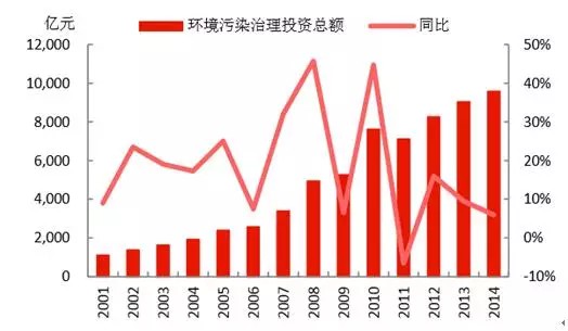 從國(guó)家統(tǒng)計(jì)局的數(shù)據(jù)可以看到,我國(guó)在環(huán)境污染治理方面的投資量,呈現(xiàn)上升趨勢(shì),2014年達(dá)到9576億元;近年占GPD的比重維持在1.5%左右,較2001年提升約0.5個(gè)百分點(diǎn)。發(fā)改委、環(huán)保部印發(fā)《關(guān)于培育環(huán)境治理和生態(tài)保護(hù)市場(chǎng)主體的意見(jiàn)》,提出目標(biāo),“十三五”綠色環(huán)保產(chǎn)業(yè)產(chǎn)值年均增長(zhǎng)15%以上,遠(yuǎn)高于CDP的增長(zhǎng)目標(biāo),為經(jīng)濟(jì)增長(zhǎng)注入動(dòng)力。