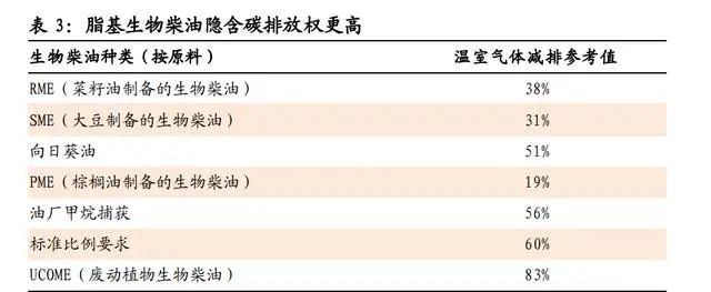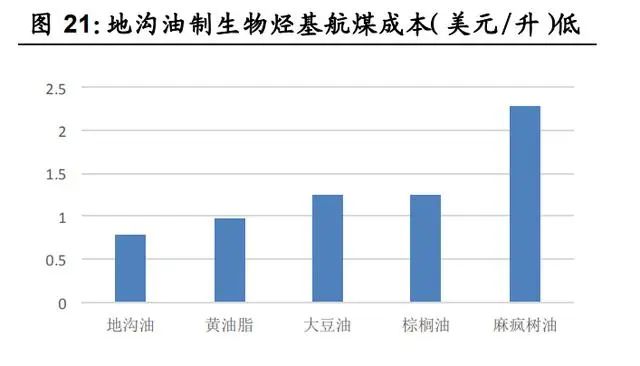 再生油:碳約束推動(dòng)需求高增,再生地溝油產(chǎn)業(yè)升級(jí)將至碳約束推動(dòng)需求高增,再生地溝油產(chǎn)業(yè)升級(jí)將至。1)碳約束刺激再生油需求,歐洲生物柴油量?jī)r(jià)將長(zhǎng)期處于高位。2)國(guó)際政策推動(dòng)國(guó)內(nèi)地溝油利用“高端化”:車(chē)用油方面,“烴基化”趨勢(shì)明顯;航油方面,國(guó)際航協(xié)2050碳中和目標(biāo)推動(dòng)生物質(zhì)烴基航煤需求釋放。地溝油制烴基柴油附加值將較UCOME顯著提升,再生地溝油向著高端產(chǎn)品升級(jí)的產(chǎn)業(yè)趨勢(shì)明顯。1. 碳約束刺激需求,歐洲生物柴油量?jī)r(jià)將長(zhǎng)期處于高位歐洲生物柴油需求旺盛,量?jī)r(jià)將長(zhǎng)期處于高位。1)歐盟是全球生物柴油最大的消費(fèi)市場(chǎng),目前歐盟生物柴油消費(fèi)量占全球總消費(fèi)量的 40%。2)發(fā)達(dá)國(guó)家強(qiáng)制按比例添加:伴隨《歐盟可再生能源指令》于2021年開(kāi)始實(shí)施,歐洲公路運(yùn)輸行業(yè)的生物柴油摻混比例將從 10%提升至25%,需 求將在未來(lái)10年保持增長(zhǎng)態(tài)勢(shì)。按照目前全球生物柴油產(chǎn)能計(jì)算,到2030年歐洲地區(qū)將至少出現(xiàn)1000萬(wàn)噸/年的供給缺口;如果考慮美國(guó)拜登政府改變碳減排政策帶來(lái)的需求增加以及歐洲地區(qū)淘汰ILUC高風(fēng)險(xiǎn)燃料的影響,總體供給缺口將達(dá)1500萬(wàn)噸/年。3)廢油脂基生物柴油(UCOME)隱含碳排放權(quán)更高,節(jié)碳效果最為突出,競(jìng)爭(zhēng)優(yōu)勢(shì)明顯,長(zhǎng)期處于供不應(yīng)求狀態(tài)。2. 國(guó)際政策推動(dòng)國(guó)內(nèi)地溝油利用“高端化”,產(chǎn)業(yè)升級(jí)將至目前我國(guó)地溝油資源化終端產(chǎn)物主要以脂肪酸甲酯為主,隨著國(guó)際政策驅(qū)動(dòng)以及地溝油脫氧加氫制先進(jìn)燃料生物烴基柴油/航煤技術(shù)進(jìn)入成熟階段,我國(guó)地溝油資源化終端產(chǎn)品將由脂肪酸甲酯產(chǎn)品向生物質(zhì)烴基柴 油/航煤升級(jí),產(chǎn)品附加值將逐步提升,產(chǎn)業(yè)升級(jí)良機(jī)將至。地溝油經(jīng)加工再利用而制備的生物質(zhì)燃料,包括生物柴油、可再生柴油以及生物質(zhì)航煤:1)生物柴油是廢油脂或動(dòng)植物油脂經(jīng)酯交換或酯化制成的脂肪酸甲酯(FAME),需要與常規(guī)化石柴油摻混使用, 目前我國(guó)地溝油資源化終端產(chǎn)物主要以脂肪酸甲酯為主(UCOME);2)可再生柴油是廢油脂或動(dòng)植物油脂通過(guò)加氫和異構(gòu)化得到的烴基柴油(HVO/HEFA),為國(guó)際認(rèn)可的先進(jìn)生物燃料,可完全替代化 石柴油或與化石柴油制成調(diào)和燃料;3)生物質(zhì)航煤是由廢油脂經(jīng)加氫處理得到 HEFA 后,經(jīng)異構(gòu)化生成。國(guó)際政策推動(dòng)國(guó)內(nèi)地溝油利用“高端化”:1)車(chē)用油“烴基化”趨勢(shì)明顯。未來(lái)伴隨歐洲對(duì)于添加比例、排放標(biāo)準(zhǔn)等約束趨嚴(yán),車(chē)用油面臨“烴基化”趨勢(shì),生物柴油將向著可再生柴油方向升級(jí)。2) 國(guó)際航協(xié) 2050碳中和目標(biāo)推動(dòng)生物質(zhì)烴基航煤需求釋放。國(guó)際航協(xié)設(shè)立2050年實(shí)現(xiàn)碳中和的強(qiáng)制性目標(biāo),生物質(zhì)航煤作為主要減 排手段需求量將攀升。①作為高排放行業(yè)之一,2019年航空業(yè)占全 球碳排放量的 2%。②國(guó)際航協(xié)(IATA)于 2021 年 10 月通過(guò)決議, 290 個(gè)成員航司在 2050 年實(shí)現(xiàn)碳中和,助力實(shí)現(xiàn)巴黎協(xié)定控制溫升 的目標(biāo)。計(jì)劃減排量相當(dāng)于 2050 年前累計(jì)減排 212 億噸二氧化碳 當(dāng)量。③現(xiàn)有技術(shù)中,生物質(zhì)航煤為主的環(huán)保航空燃料將為主要的 減排手段,環(huán)保燃料預(yù)計(jì)貢獻(xiàn) 65%碳減排量。IATA 初步目標(biāo)為, 2025 年環(huán)保航空燃料產(chǎn)量由 2019 年的 1.4 億升提升至 79 億升, IEA 測(cè)算全球生物質(zhì)航煤的產(chǎn)量在 2021 至 2026CAGR77%。以地溝油等廢油脂作為原材料的生物烴基航煤(HFEA)目前已技術(shù)成熟、成本相對(duì)較低、得油率較高。1)HFEA 作為目前唯一進(jìn)入 商業(yè)化應(yīng)用階段的生物質(zhì)航煤技術(shù),生產(chǎn)成本為 0.88 歐元/升,為各 技術(shù)中最低,且得油率為 0.9,遠(yuǎn)高于其他技術(shù)得油率(Pavlenko et al., 2019)。2)據(jù)IRENA,地溝油生產(chǎn)生物質(zhì)烴基航煤的成本低于 大豆油、棕櫚油,根據(jù)現(xiàn)有資料測(cè)算,地溝油航煤成本僅相當(dāng)與棕 櫚油航煤的 62%,具有較強(qiáng)的成本優(yōu)勢(shì)。再生地溝油產(chǎn)品附加值將逐步提升,產(chǎn)業(yè)升級(jí)良機(jī)將至。受到成本和隱含碳稅影響,目前海外的生物質(zhì)航煤價(jià)格遠(yuǎn)高于化石航煤,生 物質(zhì)航煤的需求基本都是受到政策驅(qū)動(dòng)。據(jù) Argus media 統(tǒng)計(jì),2020 年生物質(zhì)航煤價(jià)格為化石航煤的 3-6 倍。地溝油制生物質(zhì)航煤產(chǎn)品 附加值將較 UCOME 顯著提升,再生地溝油向著高端產(chǎn)品升級(jí)的產(chǎn) 業(yè)趨勢(shì)明顯。再生塑料:政策推動(dòng)需求釋放,PET 瓶對(duì)瓶高端回收應(yīng)用替換速度超預(yù)期 回收再生利用為廢塑料的最佳處置方式。再生塑料節(jié)能減碳,