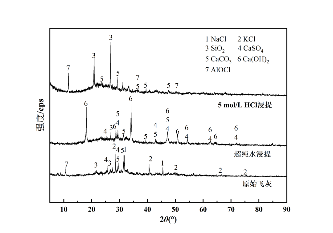 與不同地區(qū)飛灰礦物相組分對比,由表3可知,不同地區(qū)飛灰均含有碳酸鹽和硅酸鹽,且含有NaCl、KCl等可溶性氯鹽,Na、K元素來源于餐飲中食鹽等調(diào)味料的添加,高含量Cl-來源于爐排爐高溫焚燒下無機(jī)氯鹽的揮發(fā)以及垃圾成分中的廚余垃圾、塑料制品。相較于其他地區(qū),本研究還檢測到不溶氯AlOCl組分,可能是由于飛灰中Al2O3與焚燒煙氣中的酸性氣體反應(yīng)生成。
