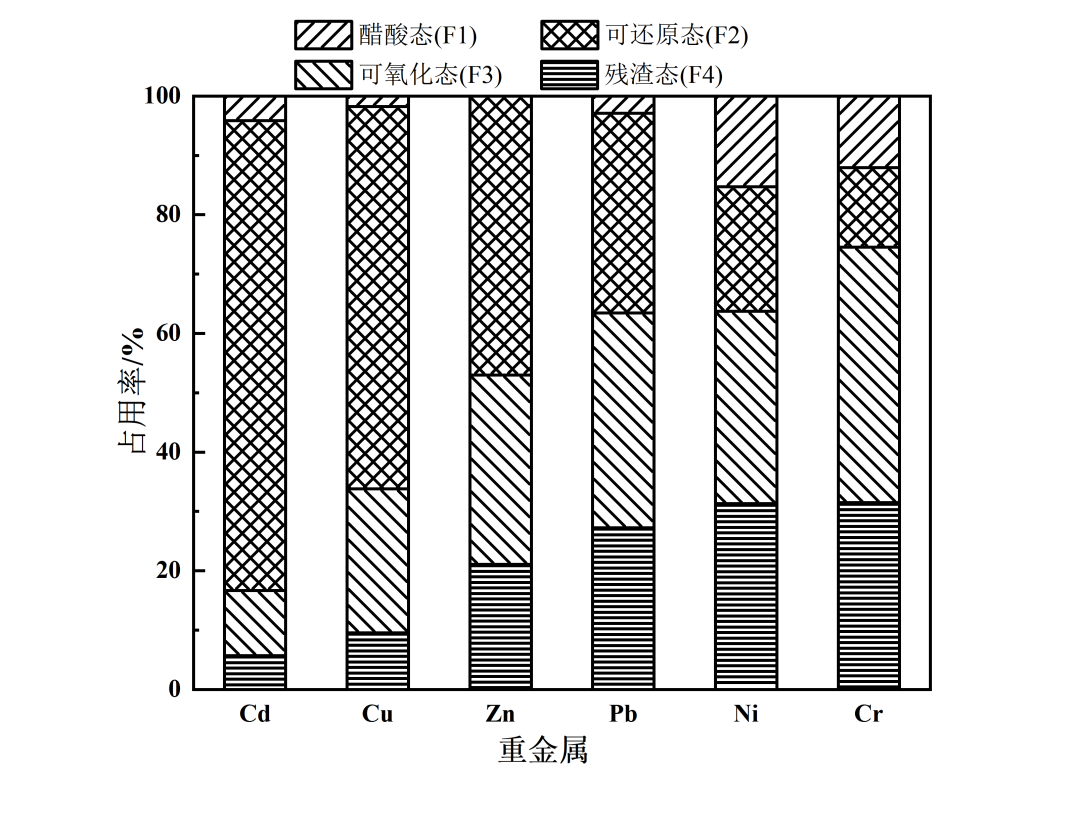 重金屬的生物有效性及潛在遷移性不僅與其總量有關(guān),還與其在飛灰中的賦存形態(tài)密切相關(guān),按照BCR分級提取法對焚燒飛灰中不同形態(tài)重金屬進(jìn)行提取測定。BCR四步連續(xù)提取法將重金屬分為F1態(tài),主要含有水溶態(tài)、可交換態(tài)和碳酸鹽結(jié)合態(tài),在中性或弱酸性條件下易浸出;F2態(tài)主要是鐵錳氧化物結(jié)合態(tài),高活性的鐵錳氧化物比表面積大,對金屬離子有較大吸附容量,在還原條件下較易釋放;F3態(tài)包括有機(jī)物與硫化物結(jié)合態(tài),這一過程提取出來的重金屬,是被有機(jī)物或硫化物絡(luò)合的部分,在強(qiáng)氧化條件下可分解;F4態(tài)中元素主要與硅酸鹽礦物組合,在自然條件下性能穩(wěn)定,環(huán)境生態(tài)風(fēng)險較小。本研究飛灰中重金屬的不同賦存形態(tài)所占百分比如圖1所示。