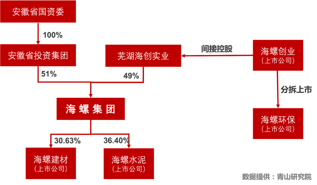 要想讀懂海螺環(huán)保,首先得搞懂隱在其身后的海螺帝國,而要搞懂海螺帝國,最好的方法就是厘清海螺系的主體海螺集團和其中海螺環(huán)保、海螺創(chuàng)業(yè)、海螺水泥、海螺型材四家上市公司的關系,因為這其中蘊藏著這個商業(yè)帝國的個性。海螺集團是國務院120家大型試點企業(yè)集團,我國最大的建材企業(yè)集團之一,世界500強企業(yè),是安徽省國企當中首屈一指的龍頭,甚至一度被稱為安徽的脊梁。其控股股東是安徽省國資委,間接持股51%,而另外的49%則是由本次分拆上市事件的主體海螺創(chuàng)業(yè)間接持有,是一家由國資控股的混合所有制企業(yè)。海螺集團手握兩家上市公司,分別是聲名赫赫的海螺水泥和海螺型材。 海螺水泥:
