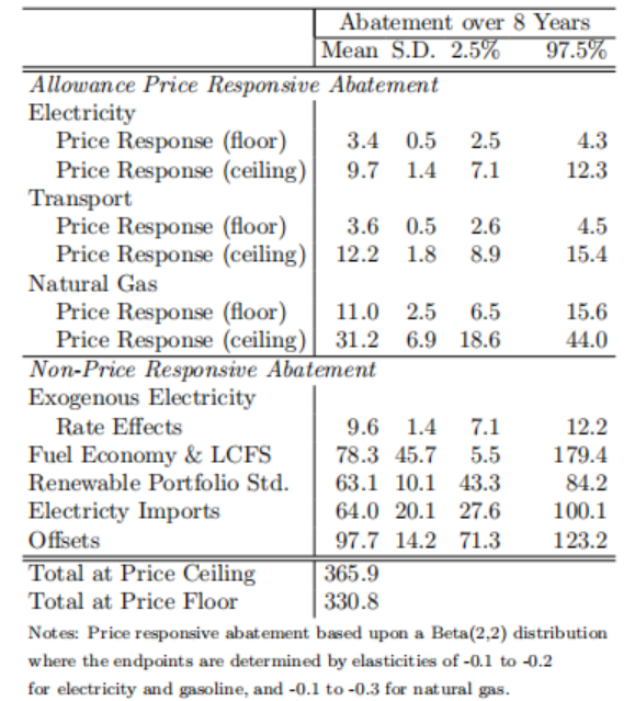 相對于價格因素而言,非市場因素對溫室氣體減排的貢獻較大。表1為2013-2020年減排供給量的估計值,該表下半部分的非市場因素,如清潔發(fā)電計劃、能效提升政策、清潔燃油政策等環(huán)境政策的減排量(Price Non-Responsive Abatement),明顯高于表上半部分的電力、燃油和天然氣等價格因素所產生的減排量(Allowance Price Responsive Abatement)。