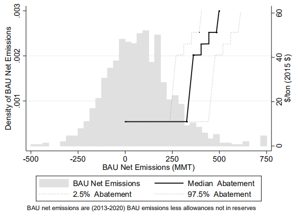 如圖2所示,通過分析減排需求和減排供給的估計值,文章發(fā)現市場出清時,溫室氣體交易的價格有94.8%的概率處于或者接近價格下限即拍賣底價(Auction Reserve Price,ARP)。這意味著相對于估計得到的BAU排放量,排放配額的設定過高,此時經濟主體通過非市場因素的配套政策即可完成溫室氣體減排約束,無需在交易市場上高價購買排放配額。價格處于“內部均衡”,即均衡價格高于價格下限ARP但低于價格上限(Allowance Price Containment Reserve,APCR)的概率為1.2%,此時溫室氣體排放的價格彈性較高,配額交易市場的減排有效性達到最優(yōu)狀態(tài)。