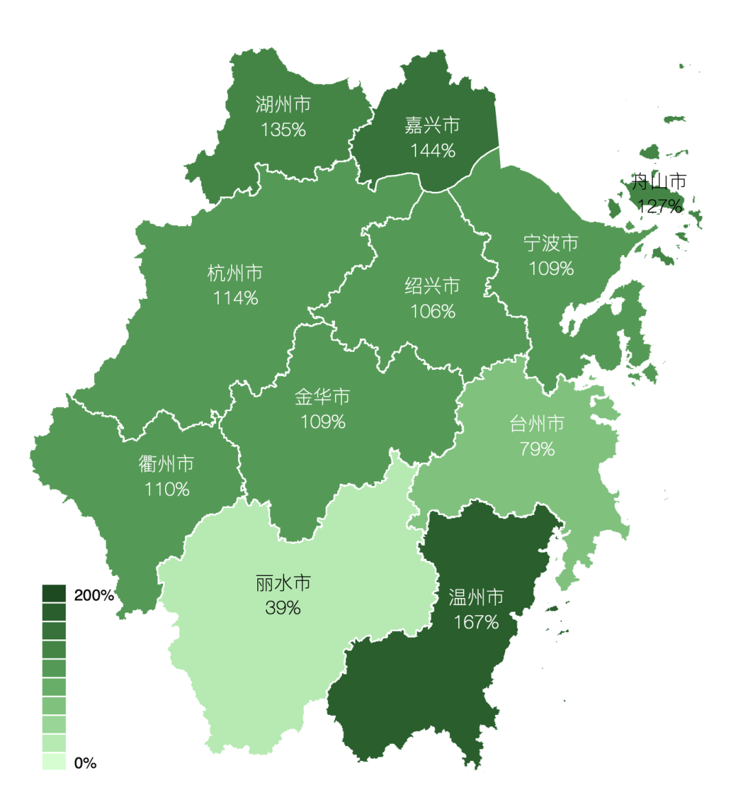 浙江省12個地級市分別以“全市”“全市城鎮(zhèn)”“市區(qū)”統(tǒng)計生活垃圾清運量、處理量,據此計算“焚燒清運比”可以發(fā)現,浙江省內生活垃圾“焚燒清運比”存在區(qū)域內不均的情況。其中溫州市、嘉興市“焚燒清運比”分別高達167%、144%。詳見圖8。