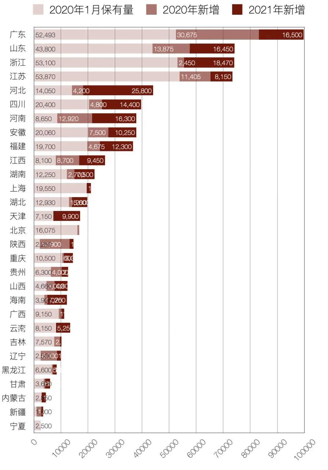 分省統(tǒng)計,陜西省、河南省、遼寧省、新疆維吾爾自治區(qū)、江西省、河北省、海南省、山西省、天津市僅2020年、2021年的增量占總處理能力的50%,即相對2019年,2年合計增幅超過100%,詳見圖2。