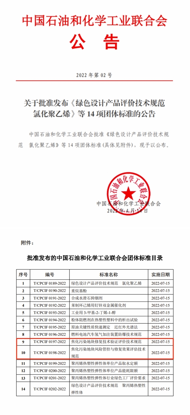 2022年4月14日,中國(guó)石油和化學(xué)工業(yè)聯(lián)合會(huì)發(fā)布公告2022年第02號(hào),正式批準(zhǔn)《焦化污染地塊修復(fù)技術(shù)驗(yàn)證評(píng)價(jià)技術(shù)規(guī)范(T/CPCIF 0197-2022)》《焦化污染地塊風(fēng)險(xiǎn)管控與修復(fù)效果評(píng)估技術(shù)規(guī)范(T/CPCIF 0198-2022)》兩項(xiàng)團(tuán)體標(biāo)準(zhǔn)發(fā)布實(shí)施。