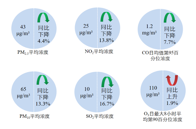1—3月,全國339個(gè)地級(jí)及以上城市平均優(yōu)良天數(shù)比例為83.8%,同比上升2.9個(gè)百分點(diǎn);PM2.5平均濃度為43微克/立方米,同比下降4.4%;PM10平均濃度為65微克/立方米,同比下降13.3%;O3平均濃度為110微克/立方米,同比上升1.9%;SO2平均濃度為10微克/立方米,同比下降16.7%;NO2平均濃度為25微克/立方米,同比下降13.8%;CO平均濃度為1.2毫克/立方米,同比下降7.7%。