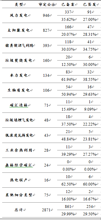 CCER開發(fā)中最主要的項(xiàng)目類型為可再生能源利用,其又可進(jìn)一步細(xì)分為風(fēng)力發(fā)電、太陽能發(fā)電、垃圾焚燒發(fā)電、水力發(fā)電、生物質(zhì)發(fā)電和地?zé)峁┡^r(nóng)業(yè)項(xiàng)目則包括豬糞便沼氣回收利用、禽類糞便利用和畜牧類糞便利用。此外,碳匯造林、低濃度瓦斯發(fā)電、工業(yè)余熱利用、森林經(jīng)營碳匯、熱電聯(lián)產(chǎn)等類型也均有10個(gè)以上的審定項(xiàng)目。備案項(xiàng)目的類型分布與審定項(xiàng)目基本一致,風(fēng)力發(fā)電、太陽能發(fā)電、豬糞便沼氣利用位列前三。林業(yè)碳匯項(xiàng)目受到氣候、降水等不可控因素影響,項(xiàng)目實(shí)施過程可能與初始設(shè)計(jì)存在偏差,且項(xiàng)目前期產(chǎn)生的碳匯吸收量較少,因此截止2017年CCER備案暫停時(shí)其整體簽發(fā)率較低。